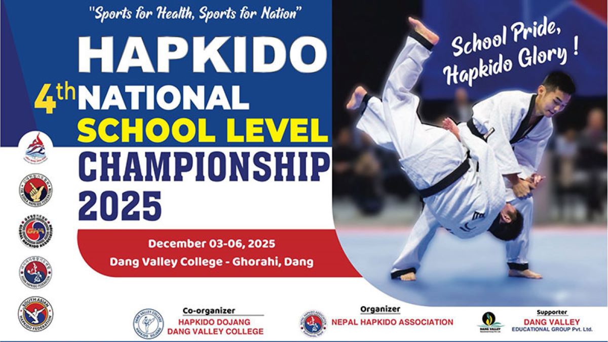 काठमाडौं । दाङको घोराहीमा चौथो राष्ट्रिय स्कुलस्तरीय हाप्किडो प्रतियोगिता–२०८२ हुने भएको छ । नेपाल हाप्किडो संघको आयोजनामा र दाङ भ्याली कलेज हाप्किडो डोजाङको सहआयोजनामा मंसिर १६ गतेदेखि २० गतेसम्म प्रतियोगिता सञ्चालन गरिने भएको हो ।