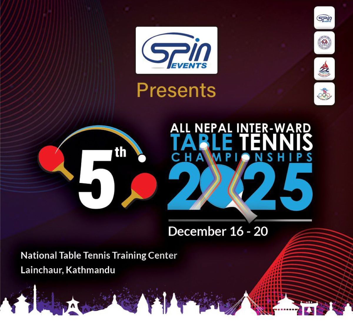 काठमाडौं । अखिल नेपाल टेबलटेनिस संघको तत्वावधान तथा स्पिन इभेन्ट्स प्रा.लि. को आयोजनामा पाँचौं देशव्यापी अन्तर वडा टेबलटेनिस प्रतियोगिता पुस १ गतेदेखि हुने भएको छ । प्रतियोगितामा विभिन्न ११ स्पर्धामा प्रतिस्पर्धा हुने आयोजक स्पिनका अध्यक्ष सुमन शाक्यले जनाएका छन् ।