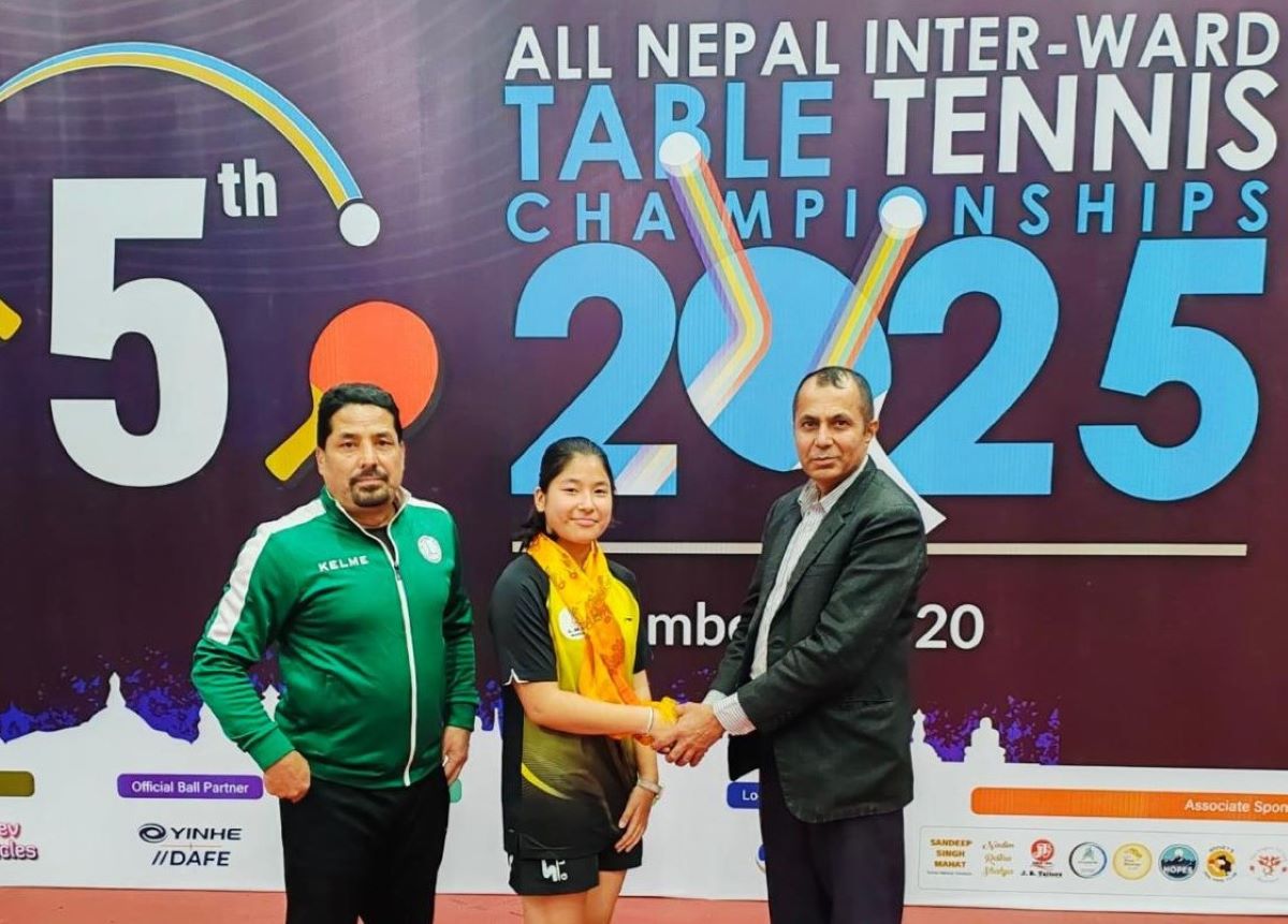 काठमाडौं । ललितपुर महानगरपालिका ८ की सुरम्य शाक्यले पाँचौं अल नेपाल अन्तरवडा राष्ट्रिय टेबलटेनिस प्रतियोगिताको यु–१६ सिंगल्स गर्ल्समा मंगलबार स्वर्ण जितेकी छन् । सुरम्य प्रतियोगितामा स्वर्ण जित्ने पहिलो खेलाडी हुन् ।
