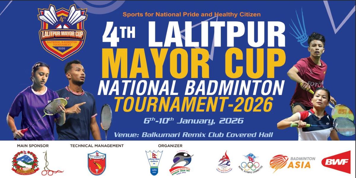 ललितपुर । ललितपुर ब्याडमिन्टन संघ र बालकुमारी रिमिक्स क्लबको संयुक्त आयोजनामा चौथो ललितपुर मेयर कप राष्ट्रिय ब्याडमिन्टन प्रतियोगिता २०८२ पौष २२ गते बाट हुने भएको छ । पाँच दिन सम्म संचालन हुने प्रतियोगिता ललितपुरस्थित बालकुमारी रिमिक्स क्लबको कभर्डहलमा संचालन हुने छ ।