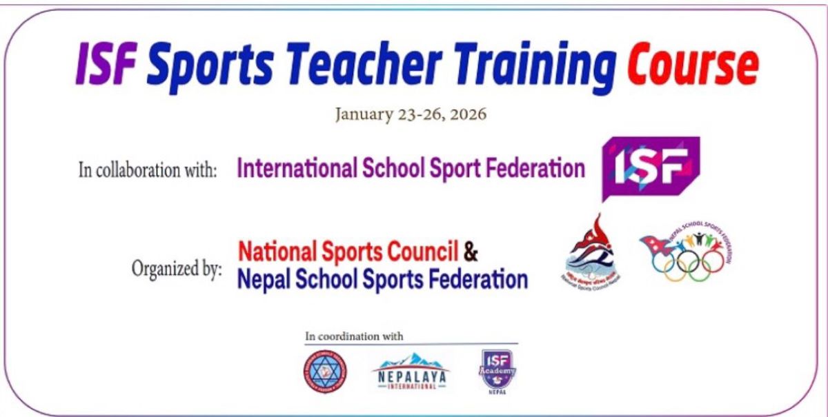 अन्तर्राष्ट्रिय विद्यालय खेलकुद महासंघ (आईएसएफ), एनएसएसएफ, नेपाल स्पोट्र्स इन्टरनेसनल तथा आईएसएफ एकेडेमी नेपालको सहकार्यमा उक्त तालिम आयोजना गर्न लागिएको हो । तालिम आगामी माघ १० गतेदेखि १२ गतेसम्म सञ्चालन हुनेछ ।
