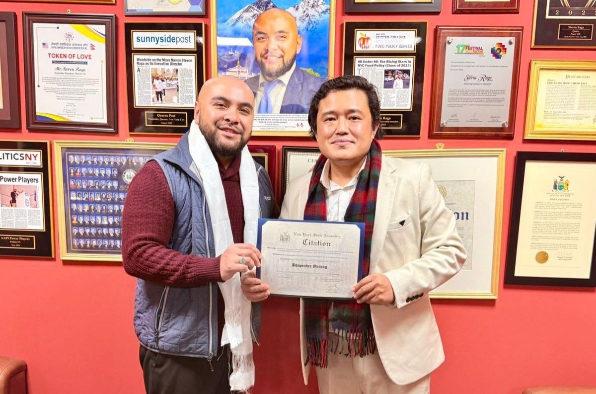 काठमाडौं । उमा कुङफुका अन्तर्राष्ट्रिय पदक विजेता भूपेन्द्र गुरुङलाई न्युयोर्क स्टेट एसेम्बलीले सम्मान गरेको छ । खेलकुद क्षेत्रमा हासिल गरेको उपलब्धीका लागि सम्मान प्रदान गरिएको भूपेन्द्रले जनाएका छन् । मेम्बर अफ एसेम्ब्ली स्टिभन बी. रागाले भूपेन्द्रलाई सो सम्मान प्रदान गरे ।
