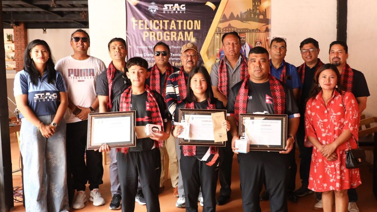 काठमाडौं । स्ट्याग च्याम्पियन्स टेबलटेनिस एकेडेमीले आइटिटिएफ एटिटियु दक्षिण एसियाली युथ टेबलटेनिस चाम्पियनसिपमा पदक जित्ने आफ्नाे दुई खेलाडीलाई शनिबार सम्मान गरेको छ । स्ट्याग च्याम्पियन्स टेबलटेनिस एकेडेमीका निश्चल थापा र सुरम्या शाक्यले सो प्रतियोगितामा नेपालको प्रतिनधित्व गर्दै पदक जितेका थिए ।